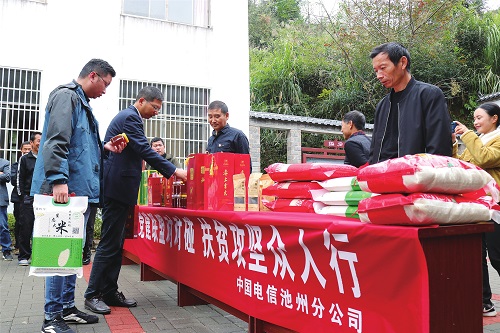 10月19日,中国电信安徽池州分公司联合当地媒体,前往大田村开展主题为“扶贫攻坚众人行”的党建联盟活动,以消费扶贫及宣传推广红色旅游、乡村振兴等活动为载体,进一步宣传红色大田,为建设美好乡村、决战决胜脱贫攻坚、实现共同富裕贡献力量。图为党员们在农副产品展台前,仔细询问并踊跃购买米、油、茶叶等农副产品。
