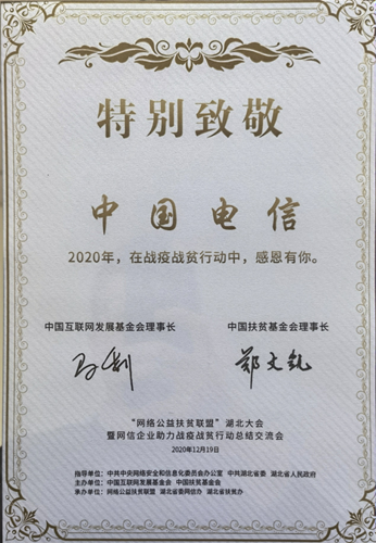 此次会议由中共中央网络安全和信息化委员会办公室、中共湖北省委、湖北省人民政府指导,中国互联网发展基金会、中国扶贫基金会主办,网络公益扶贫联盟、湖北省委网信办、湖北省扶贫办承办。会上,“网络公益扶贫联盟”高度认可中国电信发挥网络优势助力扶贫抗疫的相关行动,现场颁发“特别致敬”荣誉证书。