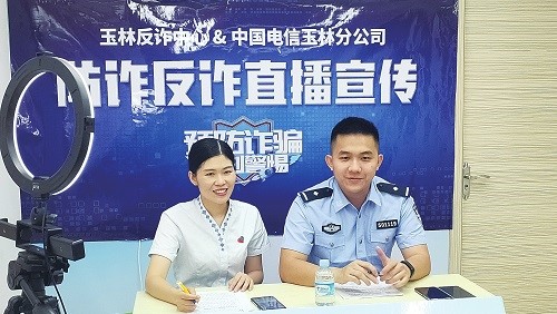 近日,为深入贯彻落实习近平总书记关于打击治理电信网络诈骗犯罪工作的重要指示精神,中国电信广西玉林分公司按照“断卡”行动工作要求,加强与公安机关联动,联合玉林市反诈中心开展防诈反诈直播宣传活动,取得了较好反响。图为玉林市反诈中心民警张逸康做客玉林电信直播间,用通俗易懂、幽默风趣的语言介绍了电信网络诈骗常见类型、诈骗方式、实施套路及受骗后的补救措施。