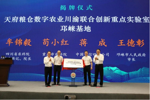 中国电信四川公司副总经理蒋成与四川省农业科学院党委书记牟锦毅、重庆市农业科学院院长苟小红、邛崃市人民政府市长王德彰共同为天府粮仓数字农业川渝联合创新重点实验室揭牌。