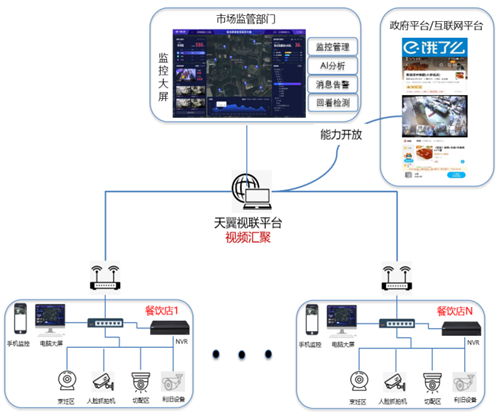 明厨亮灶数字化治理平台通过不同点位的摄像头、电信宽带、天翼云眼视频系统、集约AI能力,对店员、厨师的行为进行巡查,让食品安全更加清晰可见。对于餐饮企业而言,不仅增强员工规范操作的责任意识,也提高了餐饮企业的管理效率,将食品生产过程充分展示给社会公众,达到企业正面形象宣传效果;对于广大消费者而言,使消费者及时了解餐饮商户后厨加工过程,监督餐饮商户食品加工规范化,让消费者点得安心、吃得放心,同时公众还可在线评价、监督,参与食品安全共治;对于饿了么、美团外卖等第三方平台而言,以视频形式实时公开餐饮商户加工过程,减少对入驻商家食品安全的担忧。