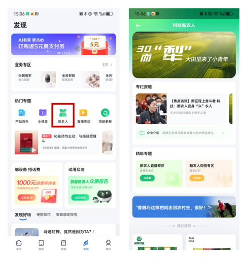 此外,为了进一步推动数字在助力农业发展上的实际应用,天翼数字生活公司在小翼管家App的“发现”板块中,建立了“新农人”专栏,今年农民丰收节,更是特邀第十四届全国人大代表、80后“新农人”代表魏巧做客直播间并进行专访,介绍自己从中国科学院的“铁饭碗”投身到“新农人”事业当中的相关经历,让更多人了解“新农人”职业,擦亮农业科技“新名片”。