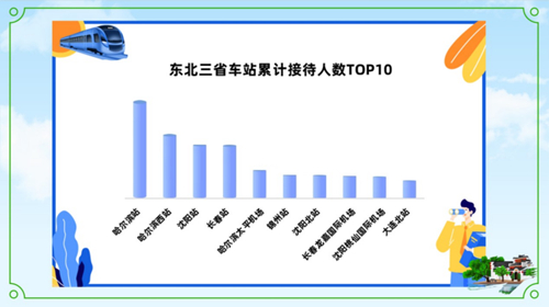 从东北三省车站累计到访人数来看,哈尔滨站累计接待人数最高,其次是哈尔滨西站和沈阳站。继“尔滨”出圈后,沈阳和长春正在成为大众选择冰雪游的新打卡地。