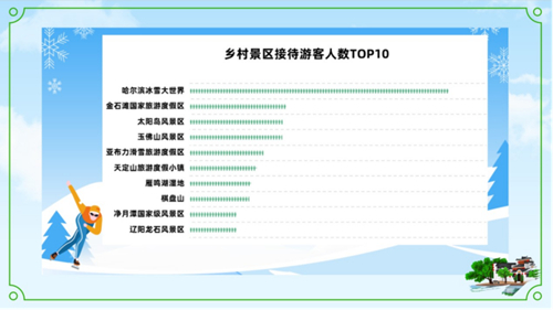 中国电信大数据显示到访东北三省的游客中,春节期间出行目的是体验东北特色的乡村冰雪文化的游客比23年提升49.3%。同时,春节期间乡村景区迎来大批游客,传统景区如冰雪大世界、金石滩度假区表现依旧强劲,亚布力滑雪场、天定山旅游度假小镇等新兴景区也成了热门到访地。