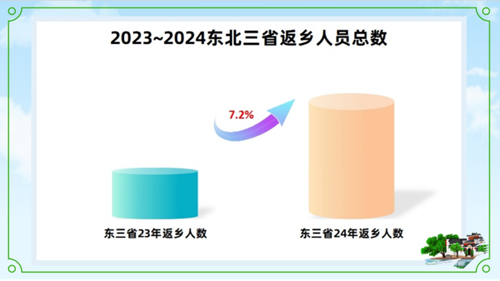 2024年春节期间,东北三省返乡人数达到了近3年的最高峰,对比23年春节增长了7.2%。这不仅反映了返乡大军的规模,也促进了地方特色美食和冰雪文化活动的发展,为乡村经济和文化的振兴提供了动力。