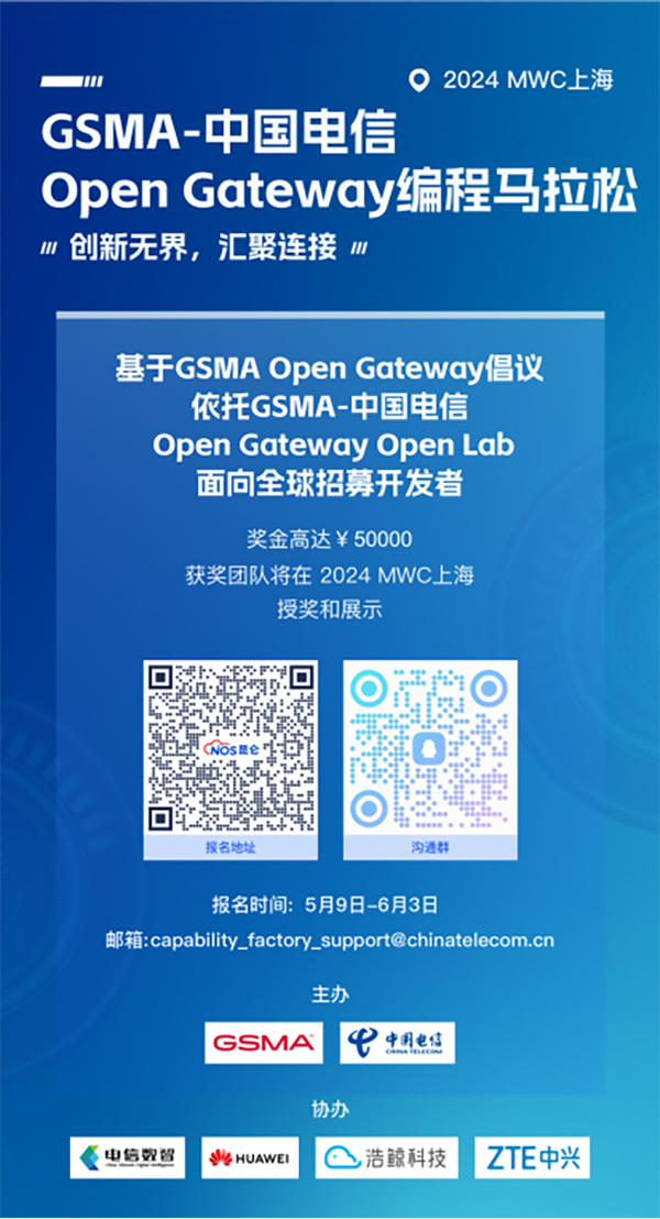 5月9日,GSMA和中国电信在京联合成立全球首个Open Gateway联合开放实验室,GSMA大中华区总裁斯寒和中国电信副总经理李峻共同为实验室揭牌,同步启动Open Gateway编程马拉松大赛。