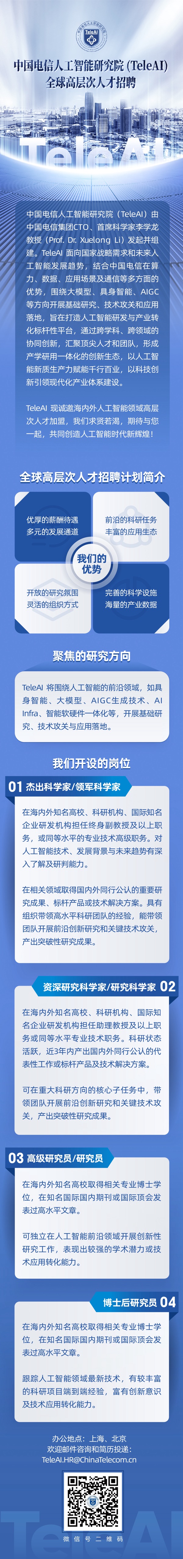 中国电信人工智能研究院(TeleAI)全球高层次人才招聘