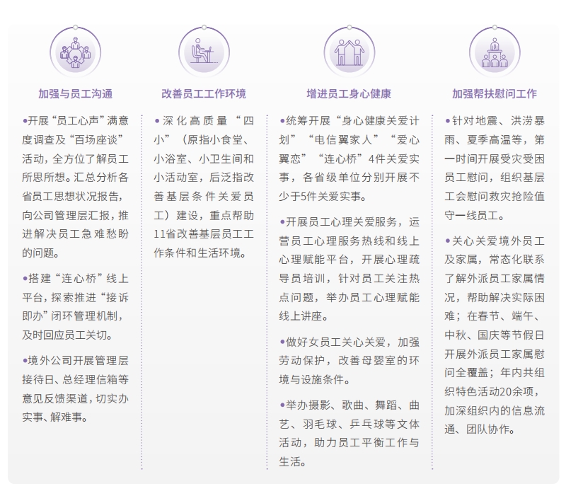 中国电信持续加强与员工沟通,了解员工诉求,加大对员工关怀,积极解决急难愁盼问题,提升广大员工获得感、幸福感、安全感,营造和谐向上的良好氛围。