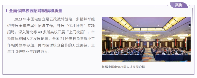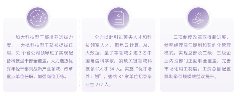 中国电信坚持人才是第一资源,发布人才强企工程实施方案,确立人才规划目标,绘制人才图谱,全方位培养、引进、用好人才。