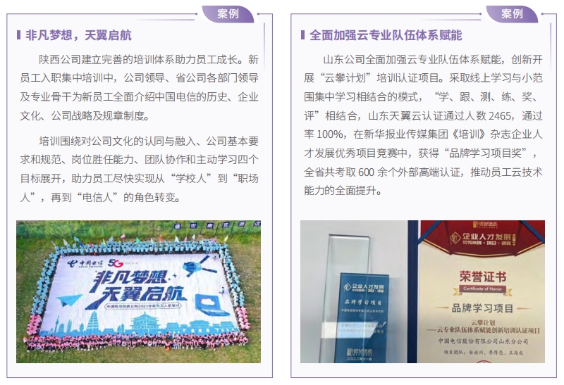 持续加强职业能力培训。全年开展 10 期“云改数转大讲堂”系列讲座,2 期“转型之道”系列讲座,超过 136万人次参加学习。分层分级规模开展技术人才培养,通过“实战 + 认证”,规模化培养产数、研发、云网三支工程师队伍。面向一线员工队伍,开展涵盖各专业条线 41 个专业的技能认证考试,覆盖 36.4 万人次,推动技能人才向卓越工程师转型。