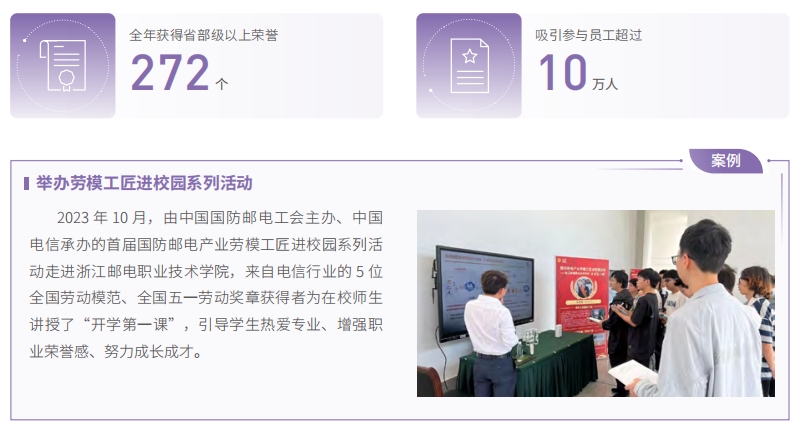 大力弘扬劳模精神、劳动精神、工匠精神,全年获得省部级以上荣誉 272 个,优化员工荣誉体系向科技创新、战新业务、产数技能倾斜,组织百余场“劳模讲堂”赋能基层一线,吸引参与员工超过 10 万人。