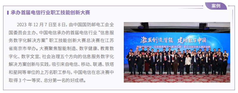 开展劳动和技能竞赛。以“云改数转我争先”为主题,开展面向全员的劳动、技能竞赛,覆盖多个专业领域和技能赛道,超过 20 万人次参加竞赛,以赛促训提升员工技能。