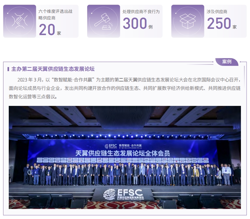 加强供应商战略合作,从供应安全、关键能力、合作规模、生态关系、履约绩效、绿色低碳六个维度评选出 20 家战略供应商。建立与上下游主要供应商的动态信息共享机制,加强信息协同;通过产业链资源整合、流程优化实现高效协作、供需匹配,促进安全协同;通过 B2B 系统直连、网关连接等方式,实现系统协同;在管理创新、供应链产品创新、合作研发等方面与供应商加强创新协同。