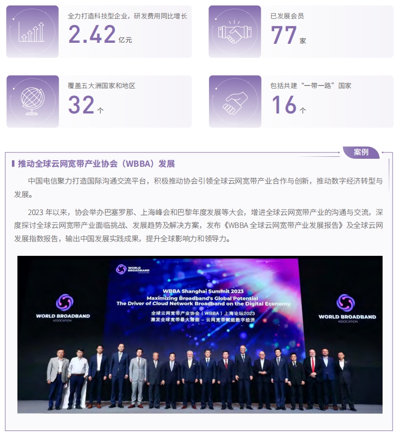 加快推动全球云网宽带产业协会(World Broadband Association ,WBBA)建设,积极吸纳全球产业合作伙伴、知名企业和机构加入 WBBA,提升会员规模和质量,已发展会员 77 家,覆盖五大洲 32 个国家和地区;其中包括 16个共建“一带一路”国家,并与全球移动通信系统协会(GSMA)签订战略合作框架协议,高质量合作生态圈初步形成,全球影响力显著提升。