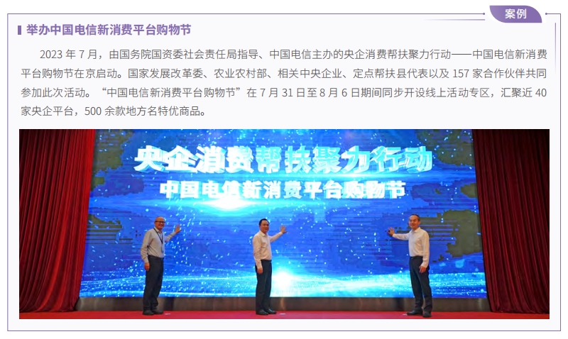 中国电信始终将消费帮扶作为促进脱贫地区特色产业提质增效和持续发展的重要途径,积极参与国务院国资委“央企消费帮扶聚力行动”“央企消费帮扶兴农周”,直接购买农副产品 1.85 亿元,帮助销售农产品 2.96 亿元。