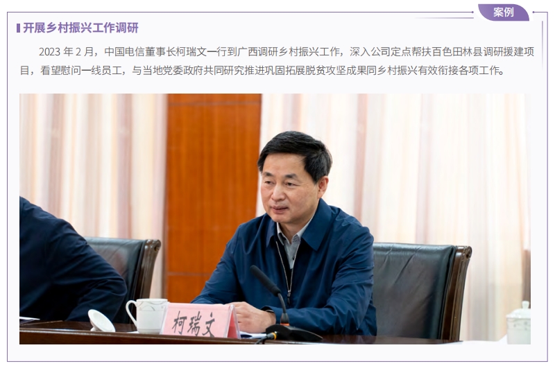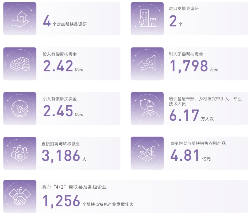 中国电信开展 4 个定点帮扶县和 2 个对口支援县(以下称“4+2”帮扶县)调研,投入有偿帮扶资金 2.42 亿元;引入无偿帮扶资金 1,798 万元;引入有偿帮扶资金 2.45 亿元;培训基层干部、乡村振兴带头人、专业技术人员 6.17万人次;直接招聘与转移就业 3,186 人;直接购买与帮扶销售农副产品 4.81 亿元,助力“4+2”帮扶县及各级企业 1,256个帮扶点特色产业发展壮大。