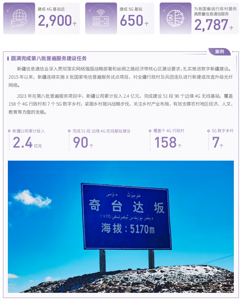 中国电信连续 8 年承担电信普遍服务任务,从铺光缆到建基站,不断提高边疆偏远地区网络覆盖,弥合区域间“数字鸿沟”。2023 年,中国电信继续深入实施第八批普遍服务,建成近 2,900 个 4G 基站,650 个 5G 基站,为我国 2,787个偏远行政村提供高质量信息通信服务。