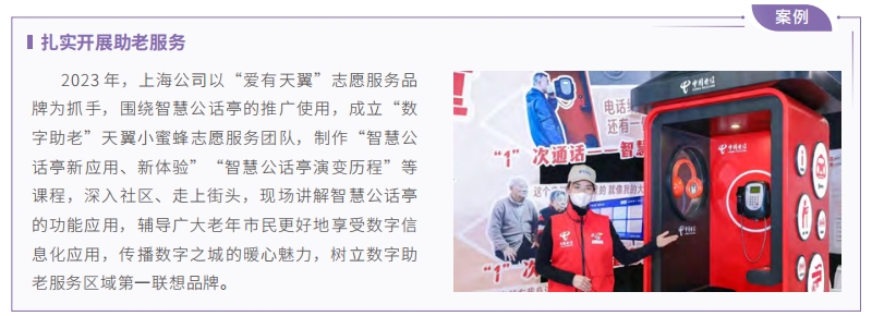 中国电信积极弘扬孝亲敬老传统美德,助力银发一族跨越“数字鸿沟”。聚焦老年人日常生活涉及的高频事项,集中力量为老年人提供更便捷、更贴心、更优质的信息通信服务和专属服务。10000 号人工热线为老年人提供约 2,034万次直接进入人工尊老专席的暖心服务,实现 10000 号远程柜台视频服务业务办理 12 万余次。营业厅爱心翼站智慧助老及防诈讲座服务 278 万人次。升级中国电信 APP,实现 AI 数字人的服务助老能力,持续完善关爱版用户体验,实现远程助老、家庭圈功能。推动适老化数字技术迭代升级,AI 守护、翼家健康等老年人产品使用感知大幅提升。