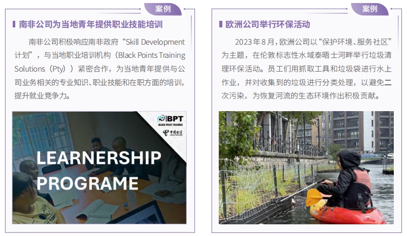 中国电信长期关注当地社区建设,积极贡献自身力量,融入当地社会、促进文化融合。持续开展海外公益活动,践行联合国可持续发展目标(SDGs)中“消除贫困”“数字化社区”“绿色环保”等倡议,构建可持续治理框架,促进政府、企业和社会通力合作,助力当地打造更具活力、包容和繁荣的社会环境。