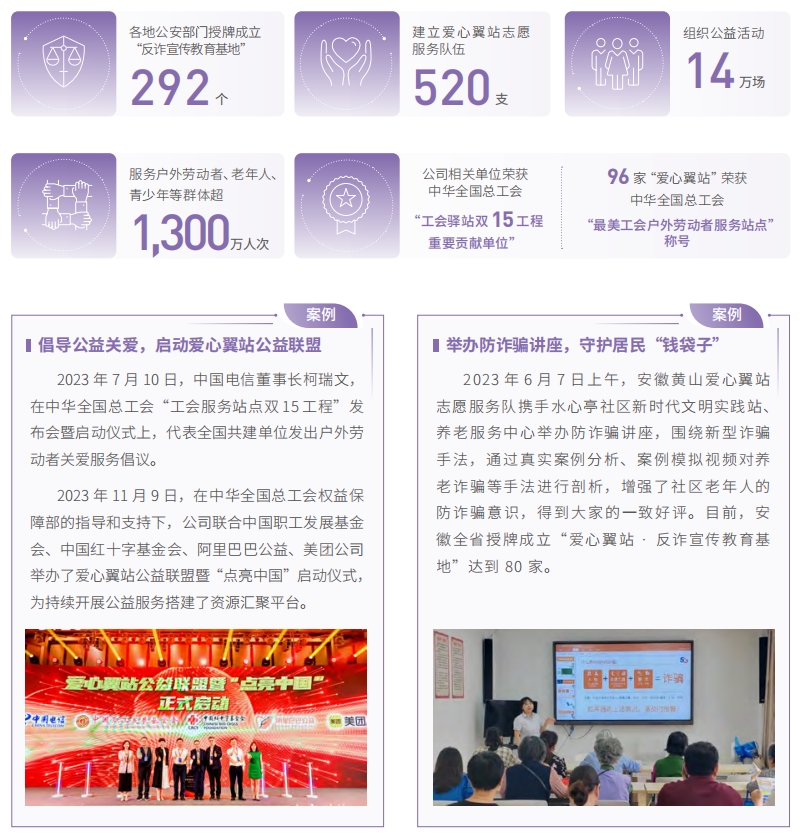 中国电信不断深化“爱心翼站”公益服务,发挥小切口大平台作用,以有温度的服务关怀社会特殊群体。建设扩充服务站点,融入属地社区开展户外劳动者关爱、智慧助老、青少年信息科普等全年龄段公益服务,打造“户外劳动者的港湾、跨越数字鸿沟的纽带、科普信息技术的讲台和防范网络诈骗的阵地”。开展爱心翼站全国点亮,实现近十万家城乡营业厅普遍加载“饮水休息、手机充电、厕所指引、手机辅导、防骗提醒、安防辅导”六项公益服务,各地公安部门授牌成立“反诈宣传教育基地”292 个,建立爱心翼站志愿服务队伍 520 支,组织“清爽夏日爱骑月”“高考加油站”“暖冬计划”等公益活动 14 万场,服务户外劳动者、老年人、青少年等群体超 1,300 万人次。公司相关单位荣获中华全国总工会“工会驿站双 15 工程重要贡献单位”,96 家“爱心翼站”荣获中华全国总工会“最美工会户外劳动者服务站点”称号,获评数量在全国共建单位中排名领先,广西河池金城江街道新建社区(爱心翼站)荣获中国科协“最美科技志愿服务点”。