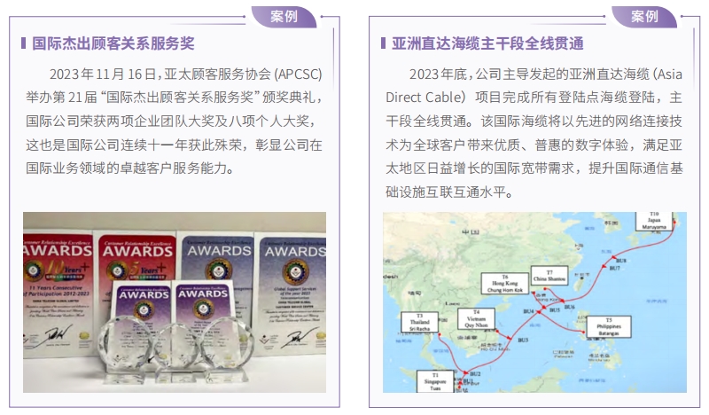 中国电信持续提升跨国通信服务能力,服务中国高水平对外开放。国际化经营覆盖全球主要市场,在全球42 个国家和地区设立 50 家分支机构,与 400 多家境外电信运营商开展了跨境数据和语音合作,为跨国企业客户提供个性化、高性价比的综合通信解决方案,积极助力中资企业走出去,外资企业进入中国市场。