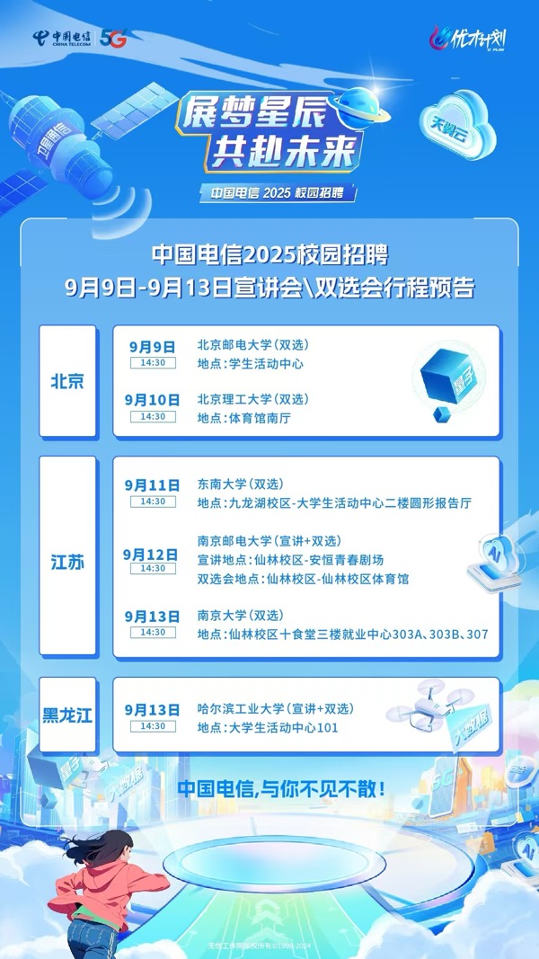 中国电信2025校园招聘9月9日-9月13日宣讲会/双选会行程预告