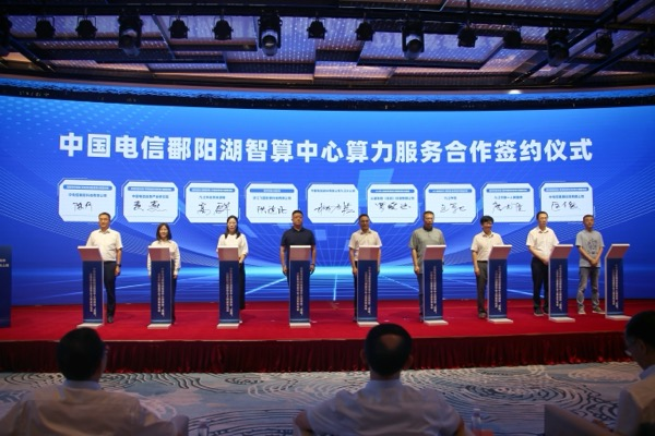 发布会现场,来自省内外教育、医疗、科研机构、工业企业等行业客户与中国电信鄱阳湖智算中心签订算力服务合作协议,成为首批智算应用客户。