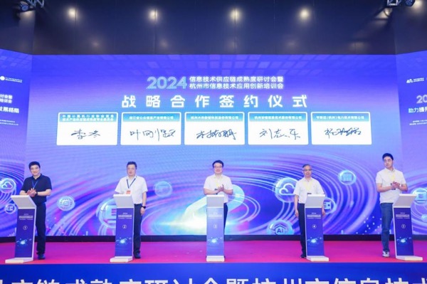 会上,浙江信产公司与中国计算机行业协会信息技术产品供应链成熟度专业委员会、杭州水务数智科技股份有限公司、杭州安恒信息技术股份有限公司、亨斯迈(杭州)电力技术有限公司签订了战略合作协议,标志着浙江信产公司和各方在信息技术供应链领域的合作将更加紧密,为信创产业链的发展注入新的动能。