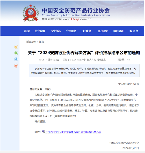 9月5日,中国安防协会发布《关于“2024安防行业优秀解决方案”评价推荐结果公布的通知》(中安协【2024】68号),由天翼数字生活公司全屋智能事业部提交的《智慧家庭综合应用解决方案》经中国安防协会在全国范围内的征集和评审,被评选为年度优秀解决方案。