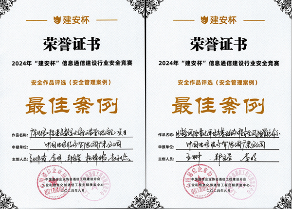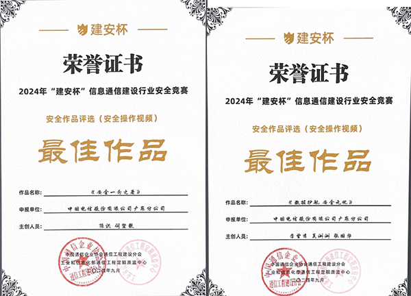 9月11日,2024年“建安杯”信息通信建设行业安全竞赛颁奖仪式在北京隆重举行,中国通信企业协会通信工程建设分会、工业和信息化部通信工程定额质监中心向中国电信广东公司颁发荣誉证书,其中由省公司云网发展部申报的“广东电信工程建设数字化安全云监管(码上安全)项目”及“以安全风险量化评估为基础的工程安全风险管控体系”获得安全管理最佳案例奖、湛江分公司申报的“安全一念之差”、清远分公司申报的“数据护航、安全无忧”获得安全操作视频最佳作品奖。