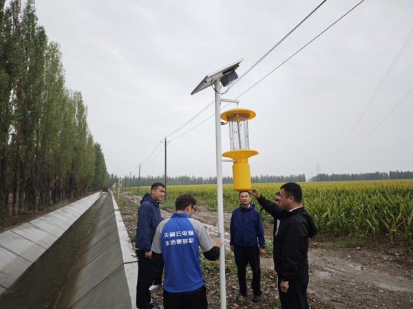 电信维护人员正在查看虫情测报灯使用情况
