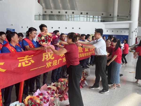 欢迎仪式上,中国电信广东湛江分公司为支援海南救灾复产队伍送上鲜花。