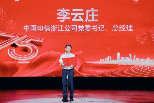 浙江公司党委书记、总经理李云庄表示,在新中国75周年华诞即将到来的喜庆时刻,在浙江公司经营发展向上向好的关键阶段,公司隆重举行庆祝新中国成立75周年员工才艺展演,充分展示了广大员工的多才多艺、积极向上的精神风貌。百年电信,红色传承,公司坚持把讲政治放在首位,坚定不移履行使命责任,坚持把发展作为第一要务,坚定不移推动高质量发展,坚持把人才作为第一资源,坚定不移凝聚智慧力量。他希望全省员工凝心聚力、乘势而上,推动企业高质量发展再上新台阶,在推进中国式现代化省域先行中更好展现作为、彰显担当、作出贡献。